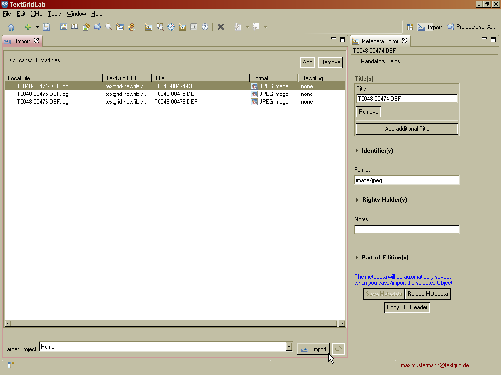 Eine Perspektive muss geöffnet sein, um dieses Werkzeug zu nutzen. Wählen Sie “Datei > Lokale Dateien importieren ...” in der Menüleiste.