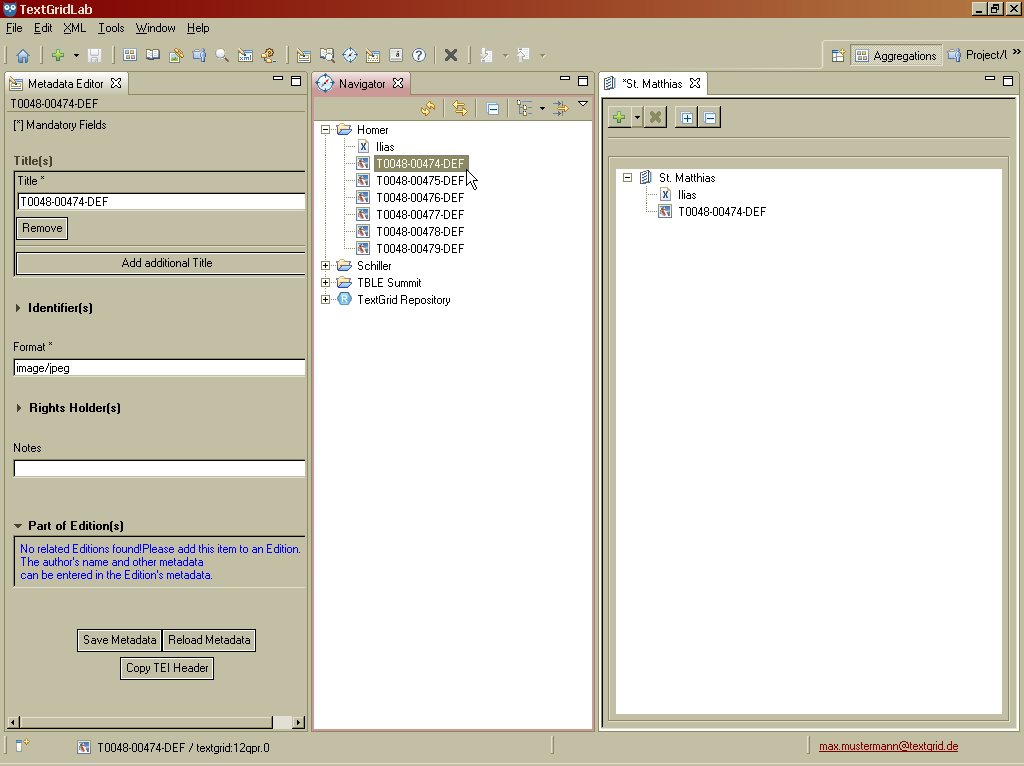 Der Aggregationen-Editor ist Bestandteil einer Perspektive mit dem Navigator und dem Metadaten-Editor. Wenn eine Aggregation bearbeitet wird, können die Werkzeugleiste und das Kontextmenü des Aggregationen-Editors verwendet werden.