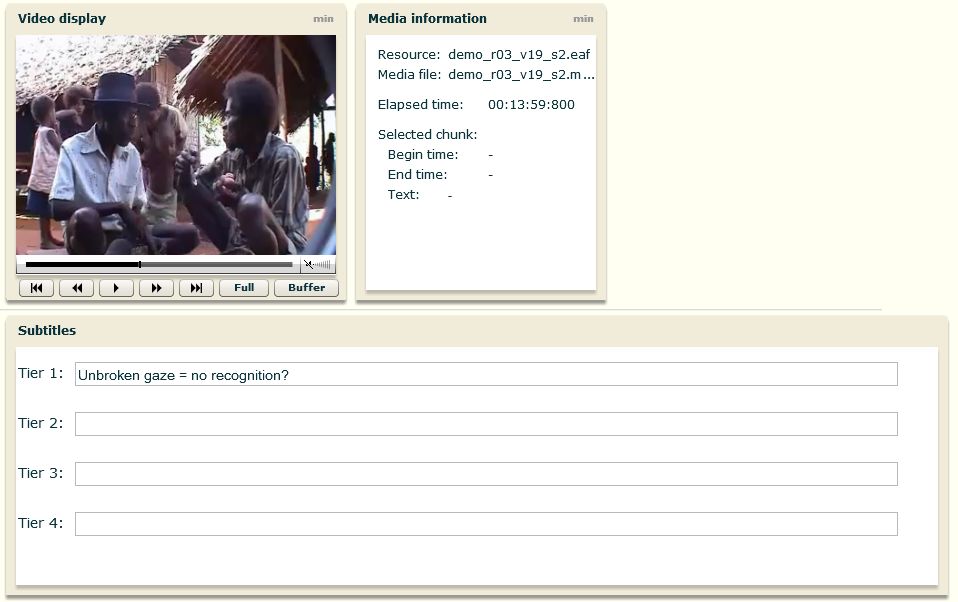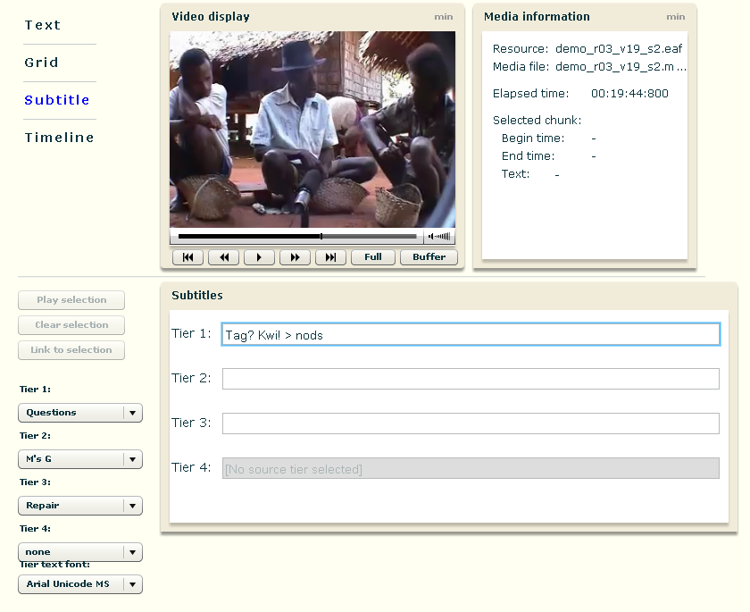 Unterhalb dieser beiden Betrachtungsmodi gibt es die Möglichkeit, den Zeichensatz der Schichten zu ändern. Rechts vom Medieninformation-Feld gibt es ein weiteres Fenster, das es Ihnen erlaubt, bestimmte Schichten isoliert zu betrachten. Während das Video weiterläuft, werden die relevanten Teile des Textes der ausgewählten Schicht rot hervorgehoben.