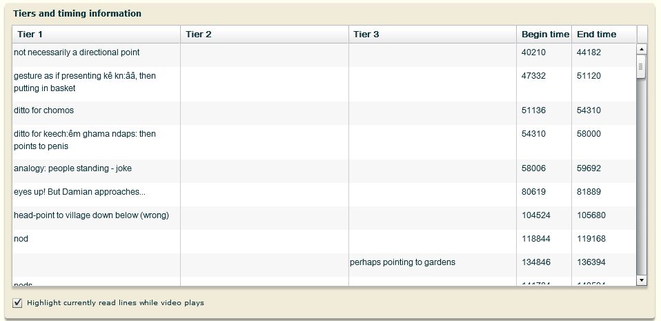 Diese Sicht zeigt eine Spalte für jede der gewählten Schichten. In jeder Spalte werden die Annotationen einer Schicht zeilenweise angezeigt. Sie können auf einen Annotation klicken, um den entsprechenden Teil der Mediendatei abzuspielen. Wenn die Aufnahme abgespielt wird, werden die relevanten Teile der Annotationen rot hervorgehoben.