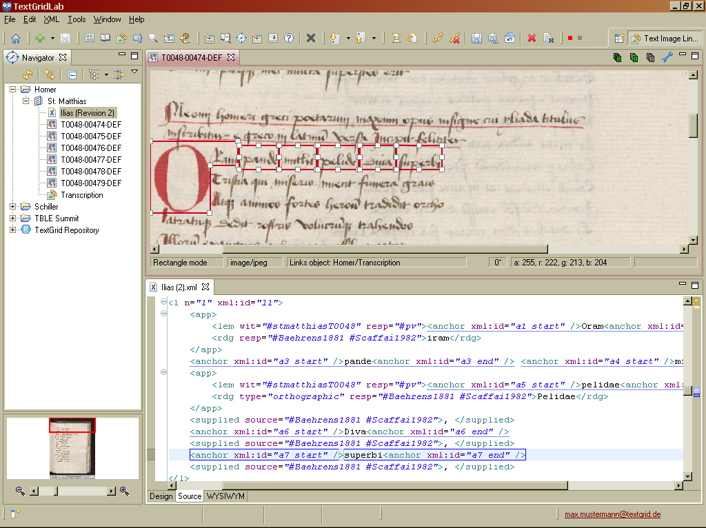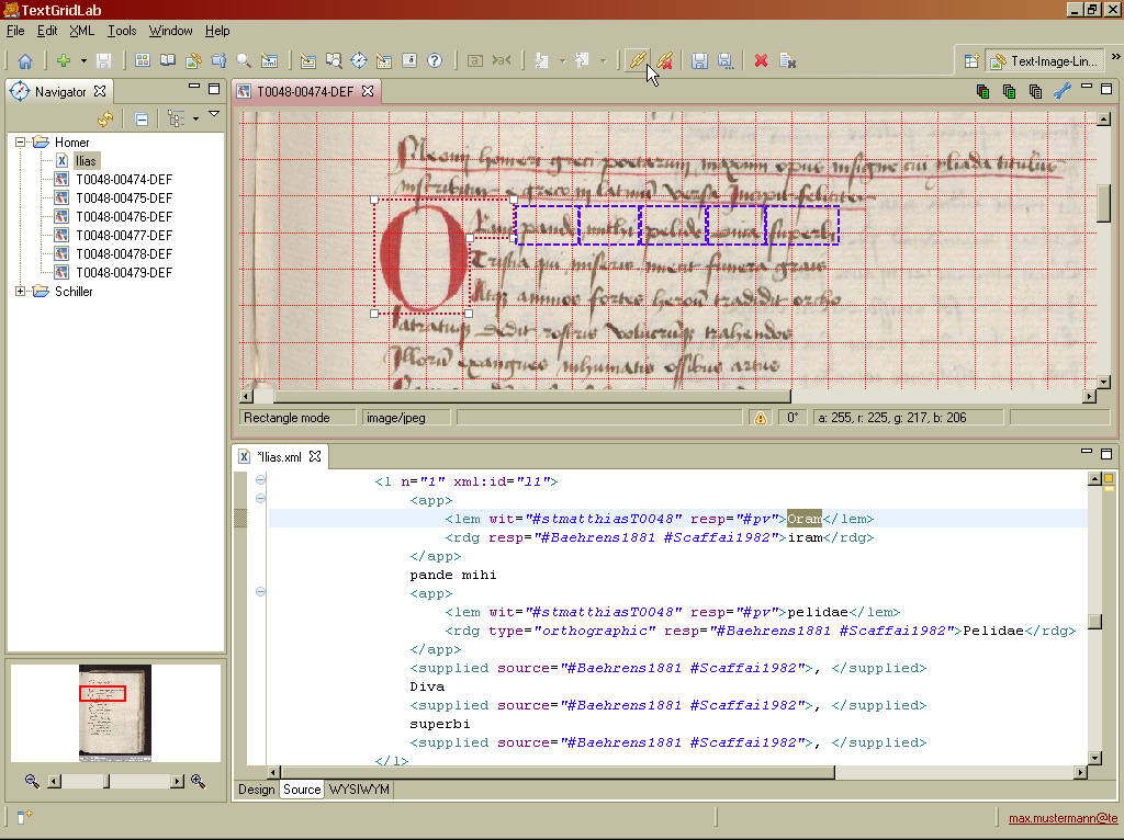- Wählen Sie Text in der XML-Editor-Sicht durch Klicken und Ziehen, durch Doppelklicken (wenn die Verknüpfung aus nur einem Wort besteht), Dreifachklicken (wenn die Verknüpfung aus einer ganzen Zeile besteht) oder durch Klicken des XML-Tags, um das gesamte XML-Element auszuwählen. Text und Bildausschnitte müssen nicht sofort verknüpft werden. Es ist auch möglich, eine größere Zahl von Markierungen zu erstellen und diese in einem späteren Schritt zu verknüpfen.