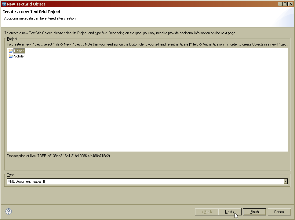Um ein Objekt zu erstellen, müssen ein Projektordner und ein Objekttyp gewählt werden. Wenn ein Projekt im Navigator vorausgewählt war, wird dieses Projekt im Assistenten “Neues TextGrid-Objekt” vorgeschlagen. Nach Klicken der Schaltfläche “Weiter” wird die Metadaten-Editor-Schnittstelle geöffnet. Vervollständigen Sie die Metadaten und klicken Sie “Weiter”. Abhängig vom Dokumenttyp unterscheiden sich die folgenden Schritte. Wenn es sich um ein XML-Dokument handelt, können Sie ein Schema wählen. Nachdem alle Pflichtfelder ausgefüllt wurden, können Sie zum Abschließen des Vorgangs “Fertigstellen” klicken.