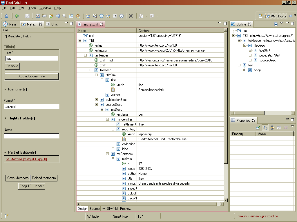 Die Entwurf-Ansicht bietet in der linken Spalte einen Überblick über die Baumstruktur des Dokuments. Die Inhalt-Spalte auf der rechten Seite zeigt das Inhaltsmodell von Elementen, die Werte der Attribute und den Textinhalt an.