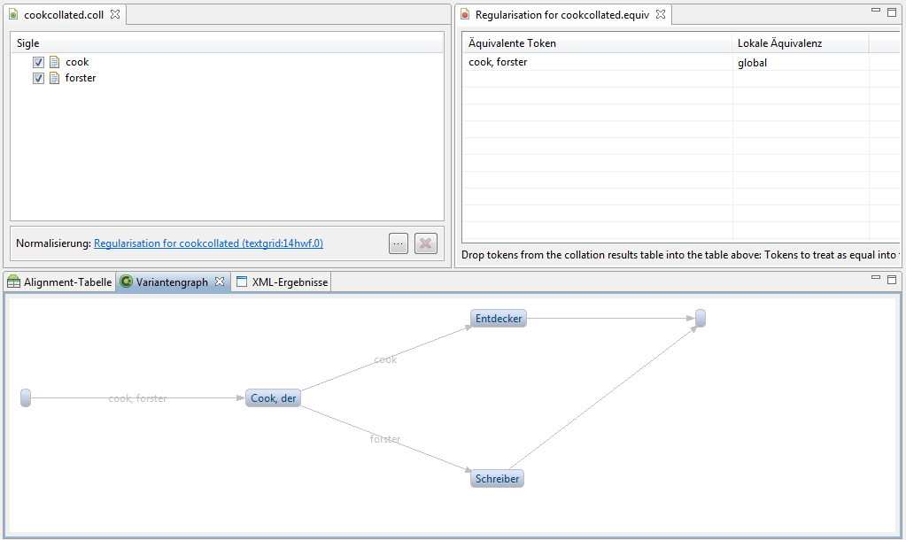 Die CollateX-Perspektive besteht aus zwei Komponenten. Die erste listet die Kollations- und Äquivalenzsets auf und die zweite zeigt die Ergebnisse der Kollationierung an.