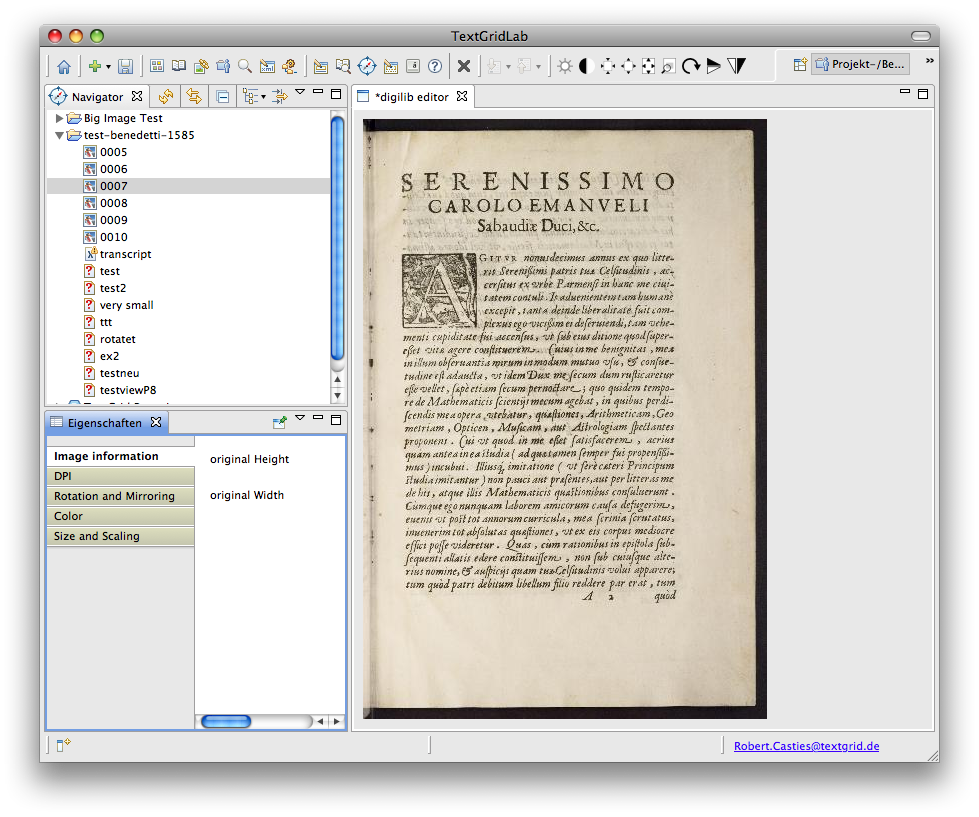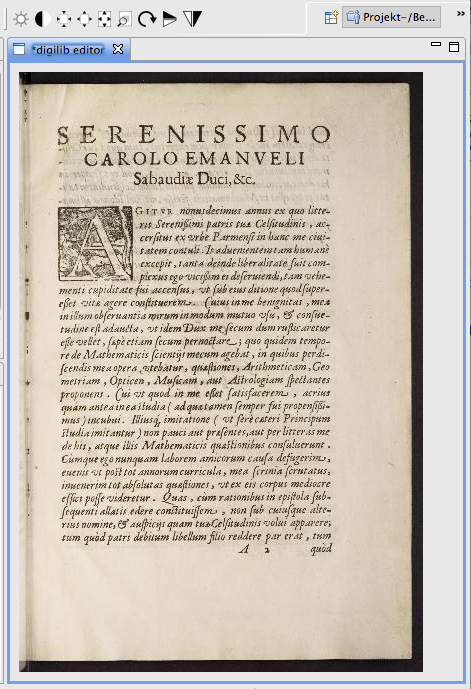 Die Digilib-Editor-Sicht zeigt das Bild in der Größe und Auflösung Ihres Bildschirms an. Wenn der Editor geöffnet ist, werden außerdem zusätzliche Digilib-Schaltflächen in der Werkzeugleiste angezeigt.