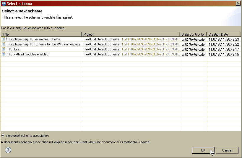 Wenn kein Schema assoziiert ist, wird das Optionsfeld “keine explizite Schema-Assoziierung” links unterhalb der Liste ausgewählt. Die Assoziierung eines Schemas mit einem Dokument wird nur dann persistent, wenn das Dokument oder seine Metadaten gespeichert werden.