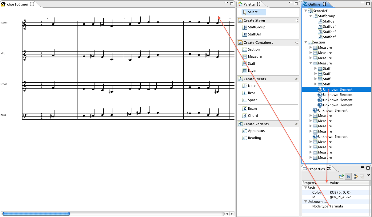 When you open an existing MEI document that was not created with the MEI Score Editor, it is possible that there will be "Unknown Elements" displayed in the Outline View. Not every possible element and attribute from the Music Encoding Initiative data format has been implemented (yet) into the MEI Score Editor. These elements and attributes are not being erased or ignored by the editor, but instead they are represented as an object with a question mark titled “Unknown Element”. Furthermore the name of this unknown element is shown as a property in the Properties View. For an example, please see the last figure below. In the source code of the MEI document, the four staves of the example have a fermata in measure 4, which can not (yet) be displayed by the MEI Score Editor.