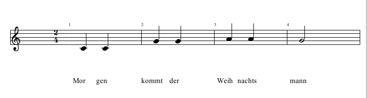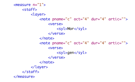 In the figure on the left you can see the result of the use of the property “Syllable” (text under a note), which you can modify for every note. It is the beginning of a German Christmas song. The value of the property “Syllable” is displayed under the note, to which you added this element. The figure on the right shows an excerpt of its corresponding source code in MEI, where you can see the usage of a “Syllable” element.