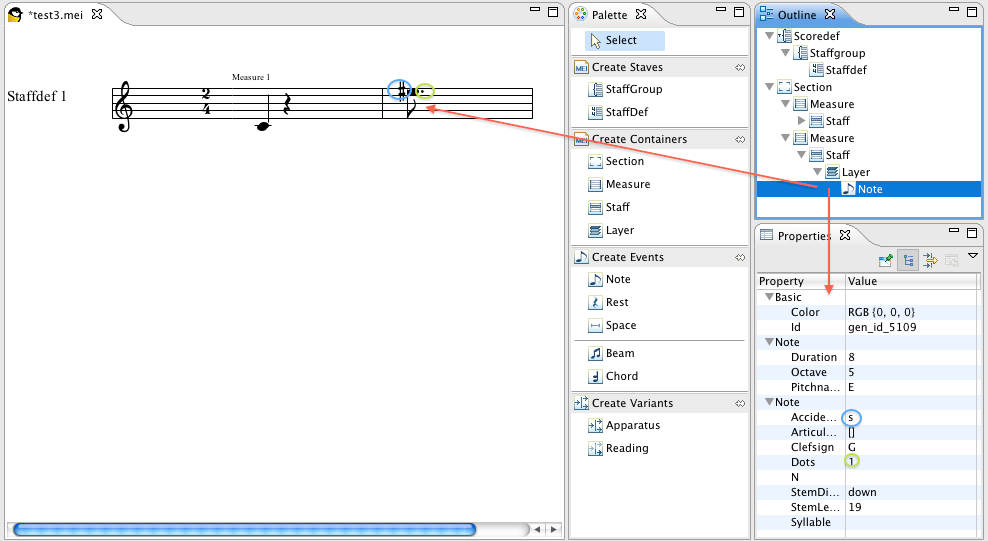 To create a "Note", you must create a “Note” element on a “Layer” in the Outline View. The default properties (e.g. Duration and Octave 4, Pitchname c) of this note are shown in the Properties View. In the figure below the table some properties of the note in the second measure, which you can edit in the Properties View, are demonstrated. All editing possibilities are listed in the following table: