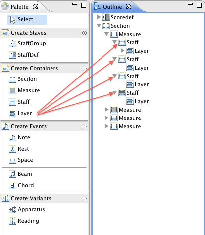 For this reason, you will need to create a "Layer" element on the staff in the Outlin View, as shown in the next figure. You can only add events to a “Layer”, since adding an event directly within a staff is not allowed.