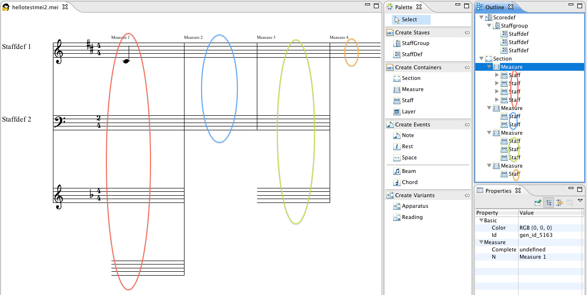 A newly-created MEI Item will already display a music sheet in four-four time with only one measure and no notes within it. The Outline View and the Properties View will appear, showing the structure of the MEI document. For more information about how to open a new MEI document, please see "Open the MEI Score Editor". Now you can create new elements for your score.