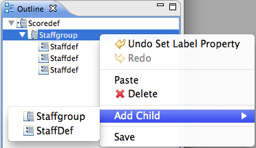 Start with a "StaffGroup", which is a group of bracketed or braced staves. A “StaffGroup” contains lines with clef and time signature. Left-click on a “StaffGroup” element in the Palette in the „Create Staves“ section and drag it into the “ScoreDef” element in the Outline View while pressing the left mouse button. After performing this action, you will see no visible results like scores or staves in the Musical Score View since you have not yet entered a musical event such as a note or rest.