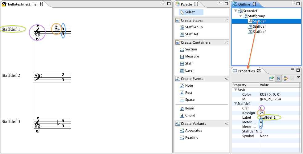 Now you can drag a "StaffDef" element, which is a container for staff meta-information, from the Palette on the “StaffGroup” element in the Outline View. In the figure below three, “StaffDef” elements have been added and named Staffdef 1, Staffdef 2 and Staffdef 3. This figure also demonstrates how to name a staff and other possible options to change or initialize properties of the single “StaffDef” in the Properties View.
