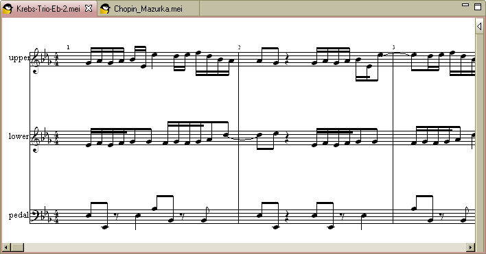 At least one perspective must be open to contain the Musical Score View. As soon as an MEI Object has been created or opened, the view will appear. In this area the musical scores that you can open from the TextGrid Repository, or create and modify with the Palette and the Outline View, will be displayed.