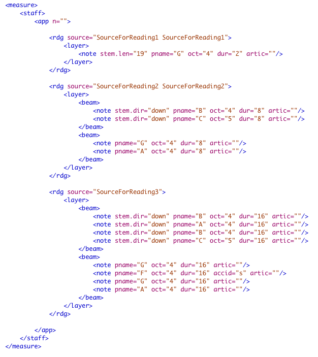 The MEI Score Editor also provides a digital representation of musical variants. This is necessary because of the limits of the presentation of variants in printed media. While the MEI Score Editor offers the opportunity to switch between different variants, the encoding of variants should be done with the “Apparatus” and “Reading” elements.