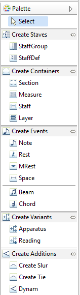 The Palette will open every time the Score View is activated. It consists of the instruments and items which you can use in the Outline View. Practical instructions for using these instruments (drag & drop onto the Outline View), are described in the section about “Using the MEI Score Editor“ . You can hide the Palette by clicking the white triangle at the top right or by moving it to the other side of the Score View by dragging it like a view.
