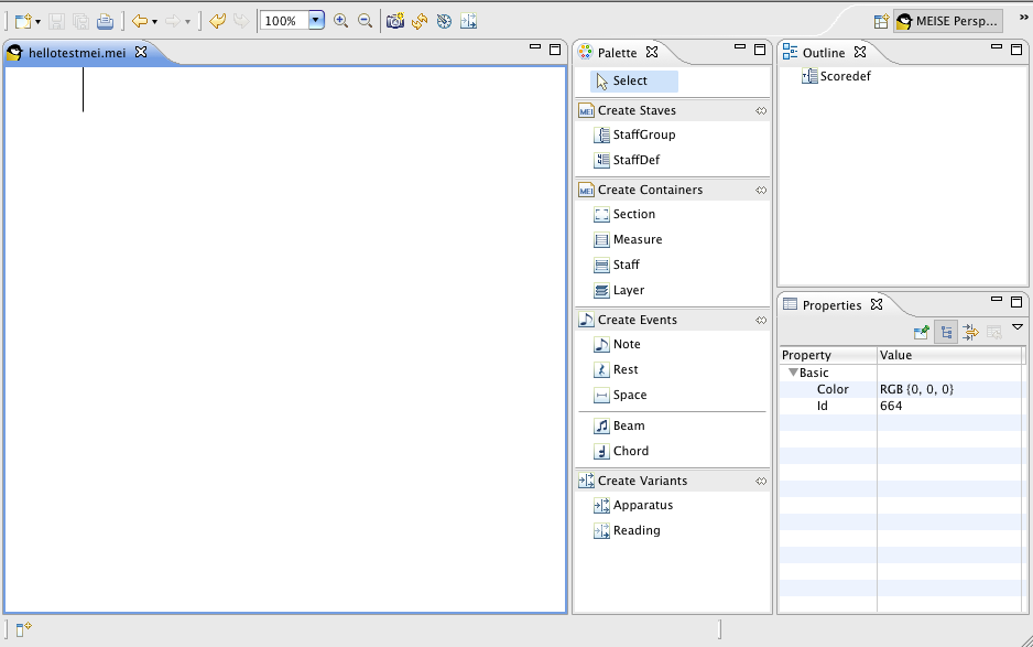 The Outline and Properties Views are only opened when an MEI document is created or opened or if the XML Editor is open in the background. Both views make it possible to edit an MEI Object.