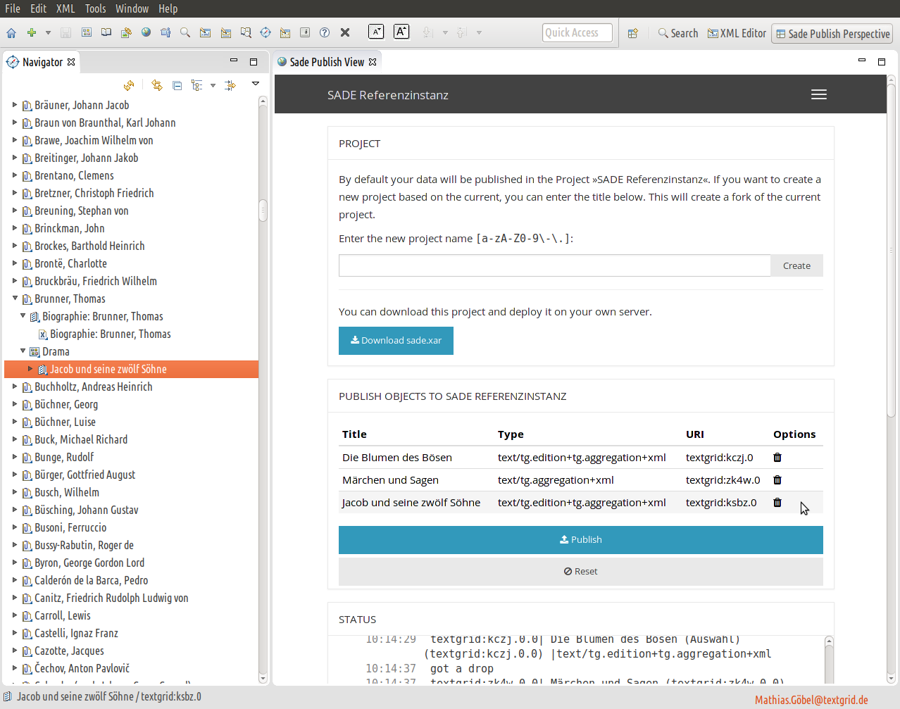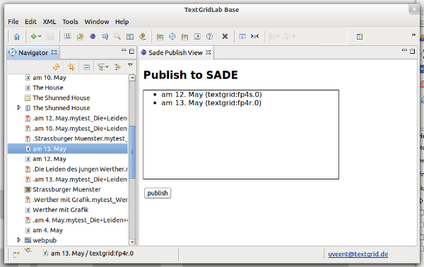 | Beschreibung | Mit SADE (Skalierbare Architektur für Digitale Editionen) können TextGrid-Projekte auf einer SADE-Instanz publiziert werden. |