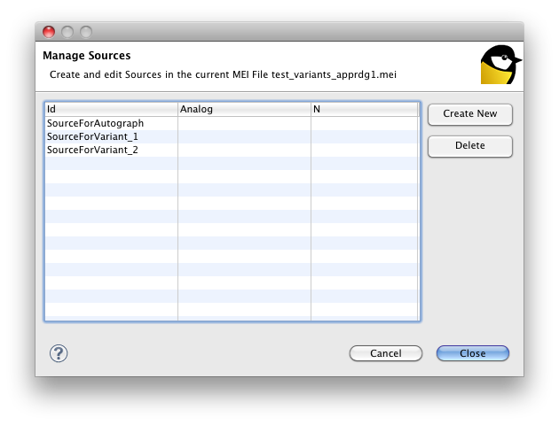 To use the possibilities for presenting different variants, you will have to declare sources for the readings. The definition which “Reading” belongs to which source is already visible in the source code of figure A in the attribute of each rdg element. Before you will be able to define the sources, you must declare them in the following way: Click the "Manage Sources" button on the toolbar of the MEISE Editor, which was already mentioned in the “Toolbar” paragraph . A new dialog box will open, as shown in the figure below. Here you can create sources by clicking the "Create New" button. Now you can give your source a name or modify the “Label” and “N(otes)” attributes. After clicking the „Close“ button, your sources will be saved.