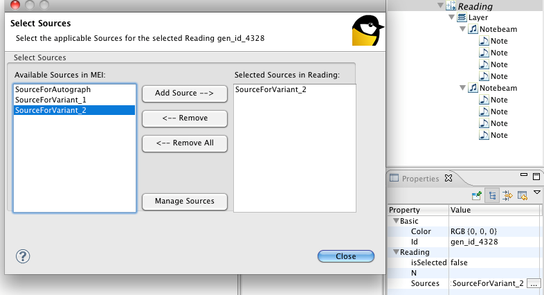 The next step is to define which source belongs to which reading. For this purpose, click on a “Reading” element in the Outline View and then open the value of its property “Rdg Sources” in the Properties View. As soon as you click the properties editor in the value column, a new dialog will open. Select a source from the available sources you have declared and click the „Add Source“ button. You can also add more than one source to a "Reading" element and you can also use the “Remove” or “Remove All” buttons. After clicking the „Close“ button, your modifications will be saved. For an example, see the figure below : here, every “Reading” element has one corresponding source.