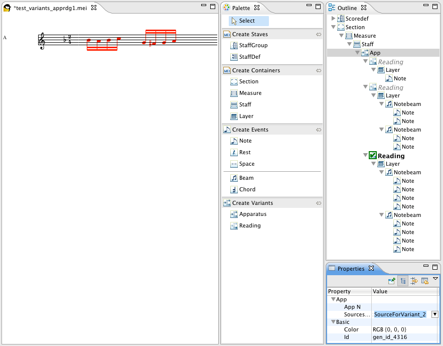 After you have added the sources to the readings, you can switch between the different variants. Click on the “Apparatus” element in the Outline View and select a source you want to see in the Properties View. In the last figure, the “SourceForVariant_2” is selected and displayed in the Score View. The selected source is also highlighted in green in the Outline View.