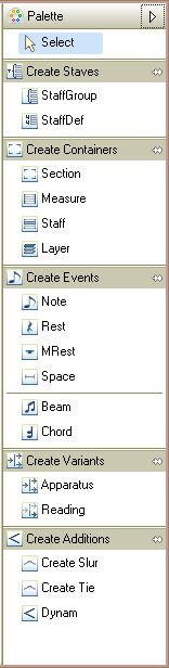 The Palette will open every time the Score View is activated. It consists of the instruments and items which you can use in the Outline View. Practical instructions for using these instruments (drag & drop onto the Outline View), are described in the section about “Using the MEI Score Editor“ . You can hide the Palette by clicking the white triangle at the top right or by moving it to the other side of the Score View by dragging it like a view.