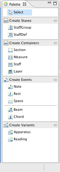 The Palette will open every time the Score View is activated. It consists of the instruments and items which you can use in the Outline View. Practical instructions for using these instruments (drag & drop onto the Outline View), are described in the section about “Using the MEI Score Editor“ . You can hide the Palette by clicking the white triangle at the top right or by moving it to the other side of the Score View by dragging it like a view.