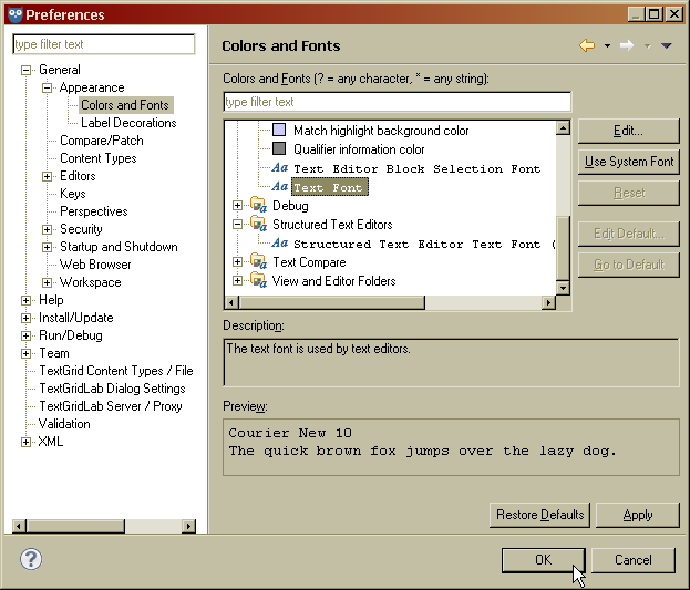 In diesem Assistenten können Sie Benutzervorgaben ändern, die wichtig für TextGrid sind. Wenn Sie beispielsweise die Schriftgröße in der Quelle-Ansicht des XML-Editors ändern wollen, wählen Sie "Allgemein" im Assistenten. Wählen Sie dann "Darstellung" und danach "Farben und Schriftarten" in der Baumstruktur auf der linken Seite. Wählen Sie "Basis" und "Text Schriftart" aus der Liste in der Mitte des Assistenten aus. Klicken Sie "Bearbeiten", um die Schriftgröße zu ändern und "OK" oder "Anwenden", um die Benutzervorgaben zu speichern.