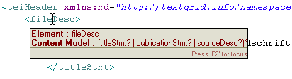 In der Quelle-Ansicht können Sie den Quelltext eines Dokuments direkt manuell bearbeiten sowie Elemente und Attribute einfügen oder entfernen. Zeilen können durch Klicken der Symbole + und – am linken Rand geöffnet und geschlossen werden. Eine Schema-abhängige Inhaltshilfe unterstützt Sie durch eingeblendete Hinweise und eine Liste von Vorschlägen beim Hinzufügen neuer Elemente.