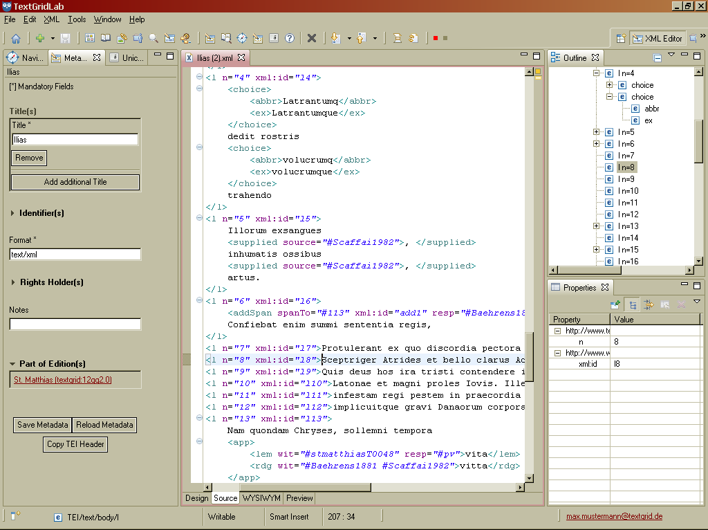 In der Quelle-Ansicht können Sie den Quelltext eines Dokuments direkt manuell bearbeiten sowie Elemente und Attribute einfügen oder entfernen. Zeilen können durch Klicken der Symbole + und – am linken Rand geöffnet und geschlossen werden. Eine Schema-abhängige Inhaltshilfe unterstützt Sie durch eingeblendete Hinweise und eine Liste von Vorschlägen beim Hinzufügen neuer Elemente.