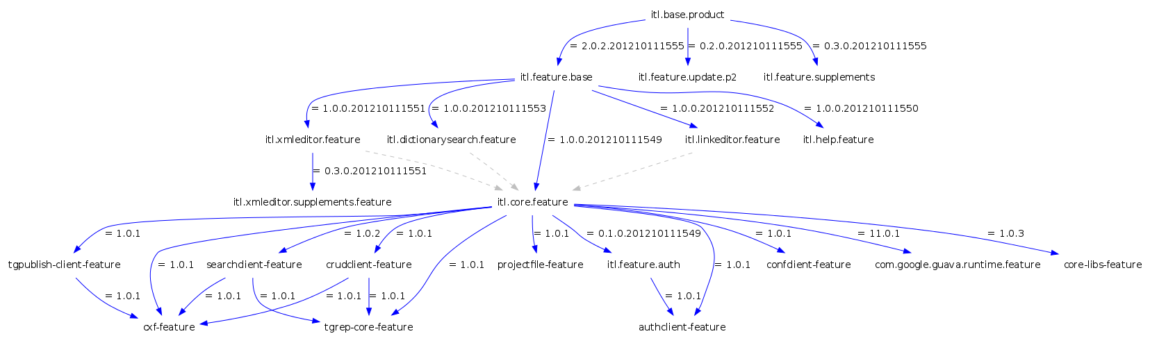 There are fixed dependencies between the features from the dependencies project (at the bottom of the image), but between many of the features, there are unversioned dependencies—with the consequence that no update will be enforced here.
