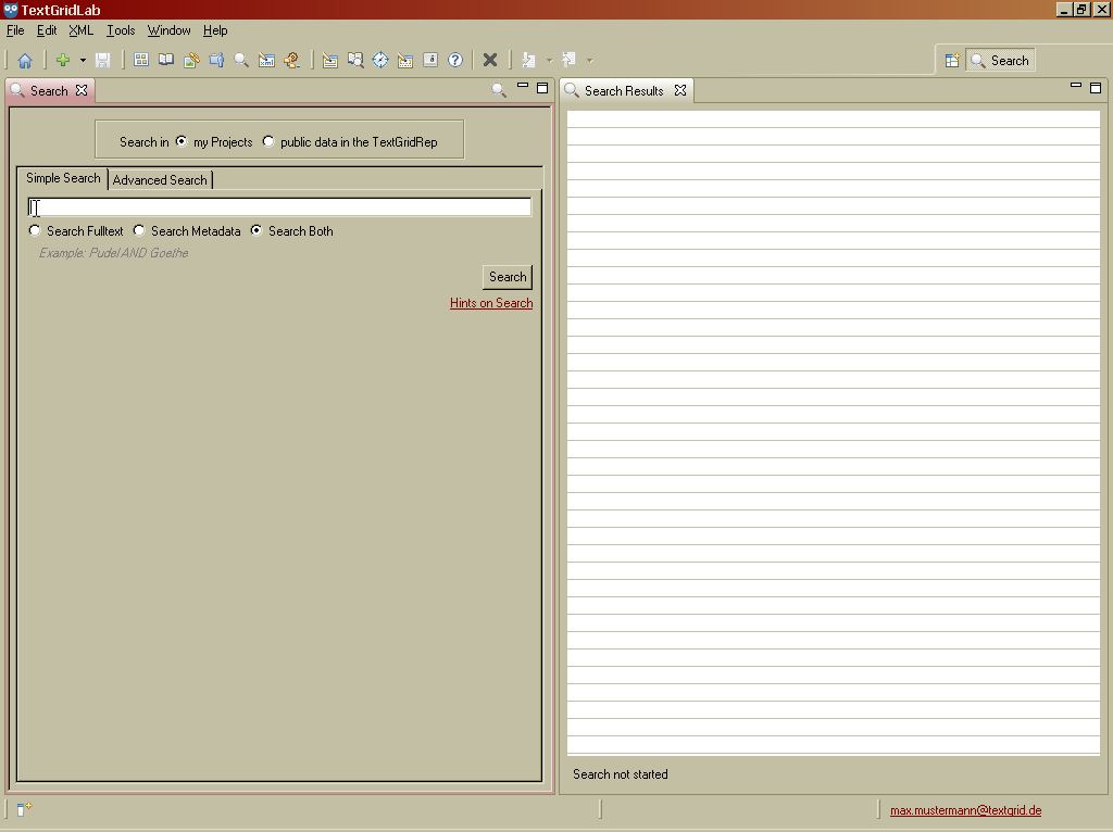 In diesem Kapitel finden Sie Informationen über die Struktur der TextGrid Laboratory-Oberfläche. Die Eclipse-basierte graphische Nutzeroberfläche besteht aus allgemeinen Menüleisten und Werkzeug-spezifischen Perspektiven. Für weitere Informationen, siehe http://www.eclipse.org/documentation/.