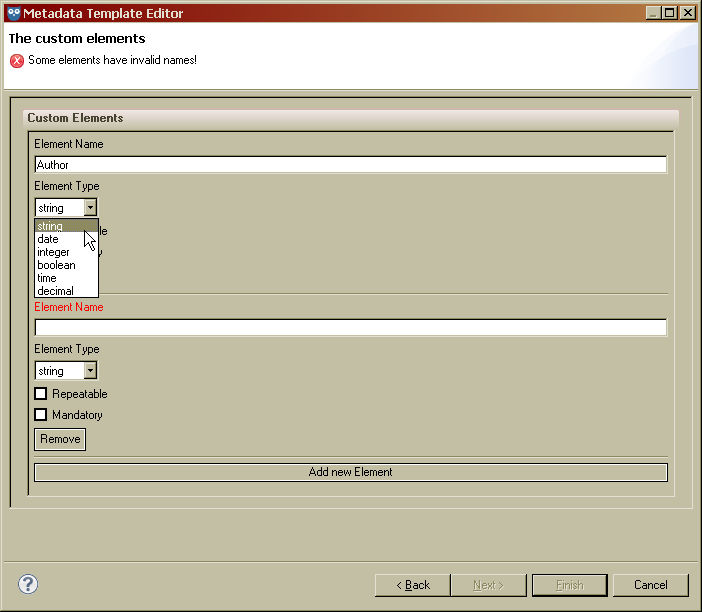 Setzen Sie wenn gewünscht Häkchen in die Ankreuzfelder “Wiederholbar” oder “Pflichtfeld”. Ein Element kann durch Klicken der entsprechenden Schaltfläche “Entfernen” aus der Liste entfernt werden. Weitere Elemente können durch Klicken der Schaltfläche “Neues Element hinzufügen” hinzugefügt werden. Klicken Sie “Fertigstellen”, um Ihre Eingabe zu speichern, oder “Abbrechen”, um den Assistenten zu schließen. Klicken Sie “Zurück”, wenn Sie ein anderes Projekt wählen wollen. Nachdem Sie den Vorgang mit “Fertigstellen” abgeschlossen haben, werden die neuen Eingabefelder für alle TextGrid-Objekte des Projekts im Metadaten-Editor angezeigt.