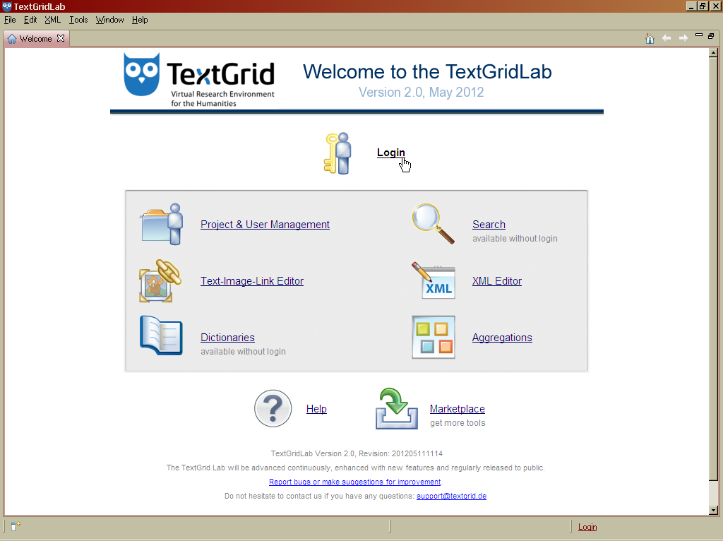 Nach der Installation des TextGrid Laboratory können Sie die Software starten. Der Startbildschirm bietet zwei Möglichkeiten: