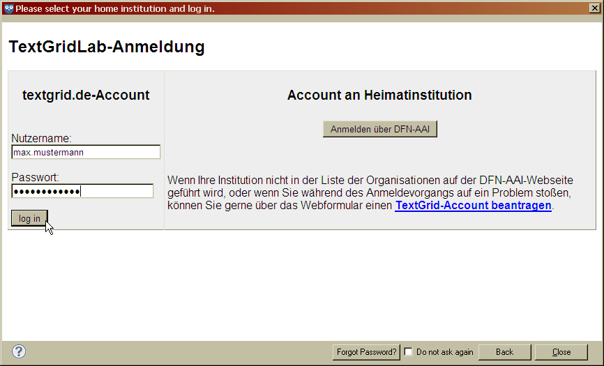 Sobald Sie auf "Login" klicken, öffnet sich ein neues Fenster. Sie können sich mit Ihren TextGrid-Nutzerinformationen (der Nutzername und das Passwort, das Sie per E-Mail erhalten haben) einloggen, oder Sie können sich über DFN-AAI (= Authentifikations- und Autorisierungs-Infrastruktur des Deutschen Forschungsnetzes (DFN)) einloggen. Wenn Sie das Passwort für Ihre TextGrid Nutzerkennung vergessen haben, wählen Sie bitte „Hilfe > Authentifizierung“ und klicken Sie die Schaltfläche "Passwort vergessen?''.
