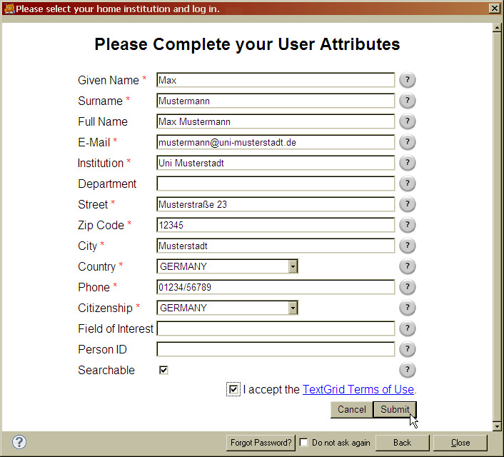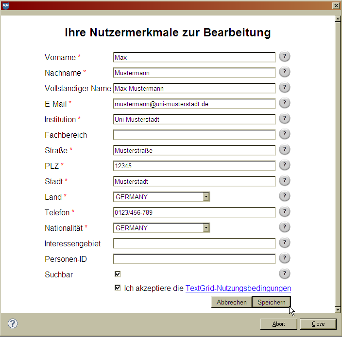 Nach Ihrem ersten Login werden Sie aufgefordert, Ihre Benutzerdaten zu vervollständigen und die "TextGrid-Nutzungsbedingungen" zu akzeptieren. Wenn Sie die Option “Suchbar” aktivieren, können andere TextGrid-NutzerInnen Sie finden, wenn Sie nach Ihrem Namen, Ihrer Institution oder Ihrer E-Mail-Adresse suchen. Die Eingabefelder mit einem Asterisk (*) sind Pflichtfelder. Sie können Ihre Benutzerdaten jederzeit über "Hilfe > Authentifikation'' in der Menüleiste des Labs ändern.
